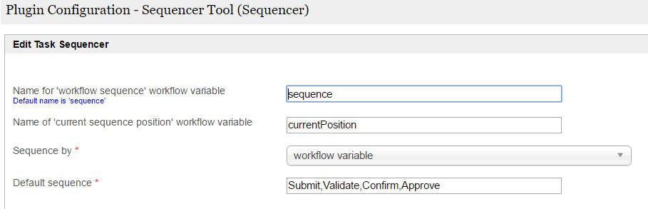 The task sequencer plugin configuration has four parameters as follows: